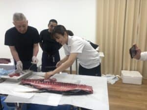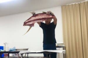 マグロの解体ショー 2024.05.23 昨日はマグロの解体ショーでした。 宮﨑県から来た、50キロの大きなマグロです。 中落ちをスプーンですくいます♪ お友達や先生が中落ちをすくっていると 「がんばれ」と言ってみんなで応援してくれました。 今日の給食では、 マグロに下味をつけて、まぐろカツにして いただきます。 大切な命に感謝して 美味しくいただきました♪ ≪前の記事へ 次の記事へ≫ 一覧に戻る